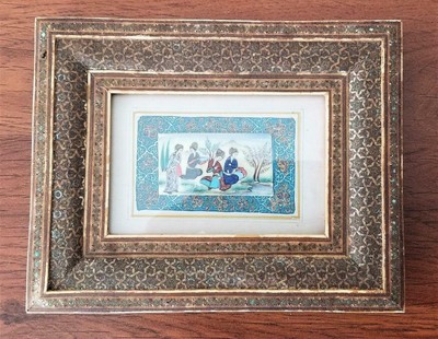 Miniature persian painting on camel bone in khatam marquetry inlaid mosaic frame.