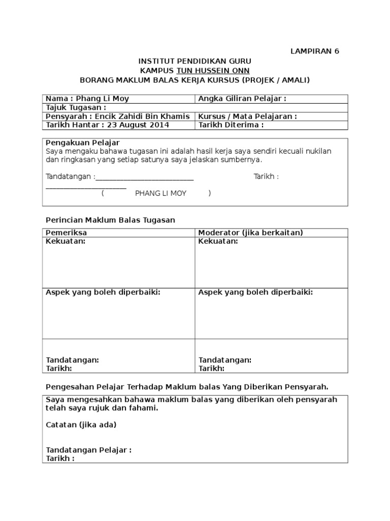 Institut pendidikan guru kampus temenggong ibrahim borang maklum balas kerja kursus ppg/pismp/ppismp nama pelajar : Math question * 7 + 8 = solve this simple math problem and enter the result. Saya mengesahkan bahawa maklum balas yang diberikan oleh pensyarah telah saya rujuk dan fahami. Meningkatkan kualiti perkhidmatan dan kemudahan dari semasa ke semasa. Perkara borang maklum b tarikh tempat :