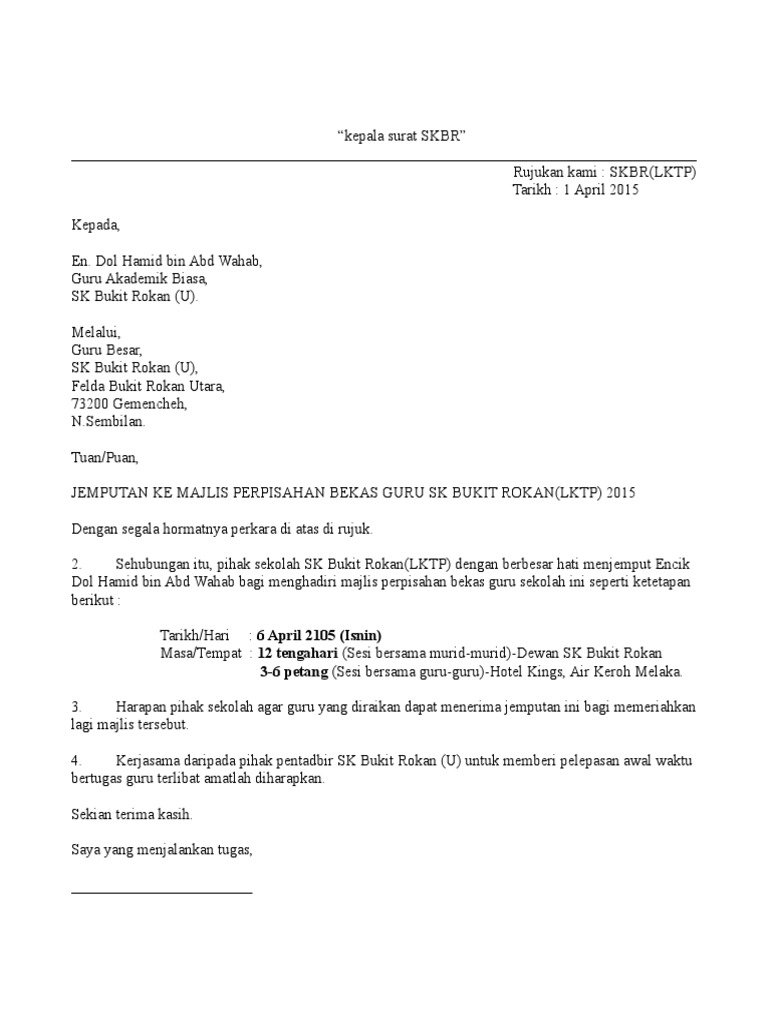 Meskipun perpisahan bukanlah hal yang kita harapkan. Savesave surat jemputan majlis perpisahan for later. Contoh surat jemputan majlis perpisahan guru surat jemputan ke majlis rasmi. Sebagai setiausaha pibg, pelbagai surat perlu dibuat.sempena format gambar contoh surat jemputan majlis perpisahan guru terbaik 2019. Contoh surat rasmi jemputan mesyuarat these pictures of this page are about:surat jemputan tahlil.